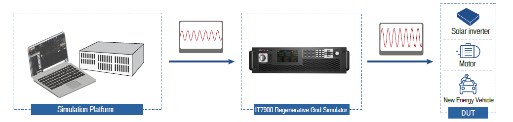 Symulator sieci regeneracyjnej serii IT7900 może być używany jako wzmacniacz mocy w celu uzupełnienia sprzętowych aplikacji zasilania w pętli (PHIL) dla mikrosieci, magazynowania energii i nowych pojazdów energetycznych. Cyfrowe Wejście/Wyjście lub standardowy zestaw sygnałów analogowych można wprowadzić za pomocą zewnętrznego interfejsu analogowego (opcja), a następnie wzmocnić bez zniekształceń do postaci rzeczywistej fali mocy z czasem reakcji zewnętrznego analogu poniżej 200 s.