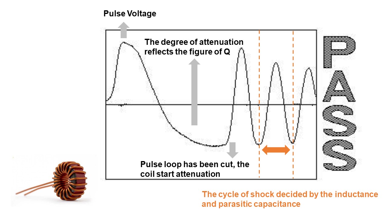 When layer short happened, the loss of power on coil increase, the resonance damping coefficient increase, resonance amplitude decrease, the total area decrease. These are the basic parameters we check layer short. By calculating and comparing the deference of area between golden sample and DUT. |