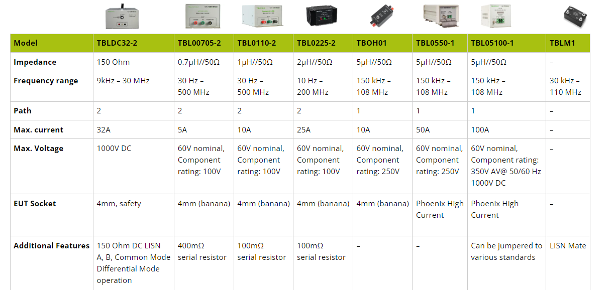 Użycie dwóch TBL05100-1-B w połączeniu z Tekbox LISN Mate pozwala na oddzielny pomiar szumu w trybie wspólnym i różnicowym. Urządzenie jest wyposażone w kabel BNC-męski do N-męskiego RG232, złącza współpracujące i wsporniki uziemienia do przymocowania go do płaszczyzny uziemienia.