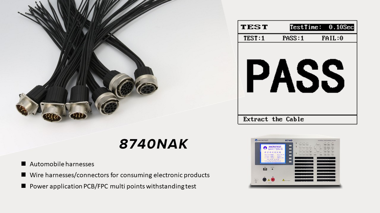 Tester wiązek kablowych MICROTEST serii 8740K wykorzystuje precyzyjną dwuprzewodową technologię pomiarową i jest odpowiedni dla produktów, które nie wymagają pomiarów bardzo niskiej rezystancji, biorąc pod uwagę czynniki kosztowe urządzenia testującego. Możliwości testowania obejmują impedancję ciągłości, obwód otwarty/zwarty, bezpieczne napięcie wytrzymywane AC/DC, pomiar rezystancji izolacji IR oraz testowanie komponentów (rezystor/kondensator/dioda). Punkty testowe można wybierać spośród 1024 opcji, z maksymalnym wyjściowym napięciem wytrzymywanym AC 700V i maksymalnym wyjściowym napięciem wytrzymywanym DC 1000V. Obsługuje oprogramowanie do łączności z komputerem PC i skanowanie kodów kreskowych, spełniając wymagania zautomatyzowanego testowania linii w produkcji przewodów i złączy.