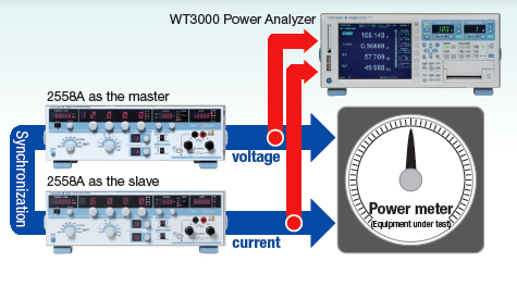 Jeden z 2558A działa jako jednostka główna i dostarcza synchronizujący sygnał oscylatora. Wymagane współczynniki mocy są ustawiane poprzez regulację przesuwnika fazowego na jednostce podrzędnej i monitorowanie wyniku na WT3000. System 3-fazowego kalibratora mocy można łatwo zbudować, dodając kolejne 2558A.