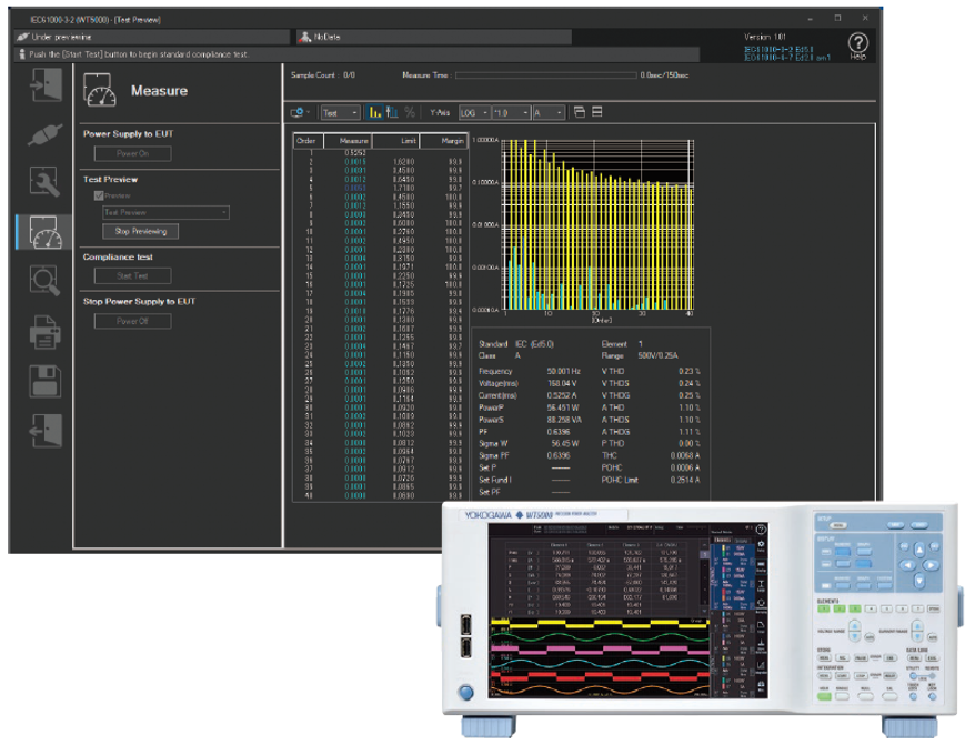 W połączeniu z opcją /G7 i oprogramowaniem pomiarowym IEC Harmonic /Flicker, dane pomiarowe harmonicznych WT5000 mogą być zapisywane w komputerze i testowane zgodnie z przepisami IEC. Do obsługi dużych urządzeń powyżej 16 A/fazę (IEC61000-3-12) można użyć modelu czujnika prądu CT200.